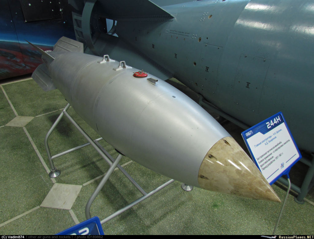• Примечания: Бестормозная тактическая авиабомба 244Н. Применение - со сверхзвуковых самолётов фронтовой авиации. Период разработки - 1957-61гг. Главные конструкторы - К.И. Щёлкин, А.Д. Захаренков