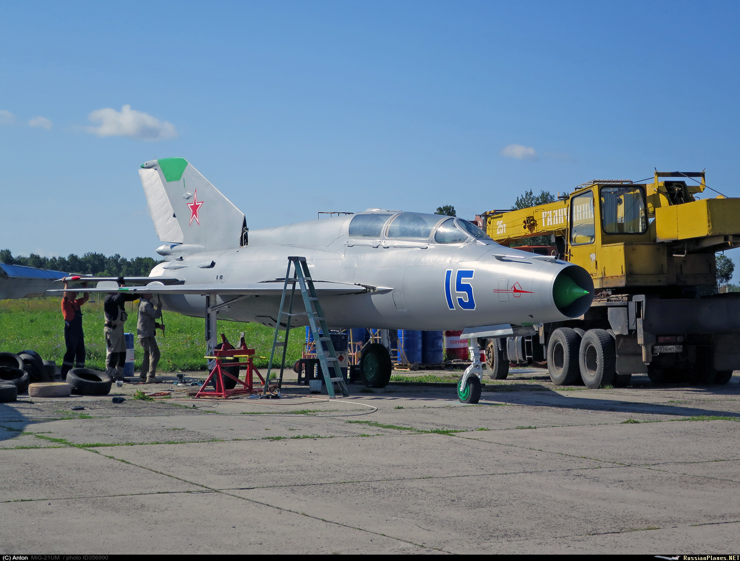 • Примечания: По заказу Музея техники Вадима Задорожного и руководителя кинокомплекса "Военфильм" Игоря Угольникова, команда "Альбатрос Аэро" подготовила новый самолёт-памятник МиГ-21УМ, который будет установлен в городе Медынь, на подъезде к территории кинокомплекса. Ранее этот самолёт эксплуатировался в школе лётчиков испытателей и запомнился зрителям авиасалона МАКС-1995 участием в уникальном пролёте пятёрки разнотипных самолётов ОКБ "МиГ" - МиГ-29УБ, МиГ-31, МиГ-25ПУ, МиГ-23УБ и МиГ-21УМ. Сейчас эта машина отреставрирована (сменила бортовой номер с 30 на 15), уже перевезена в Медынь и на днях будет установлена на постамент.