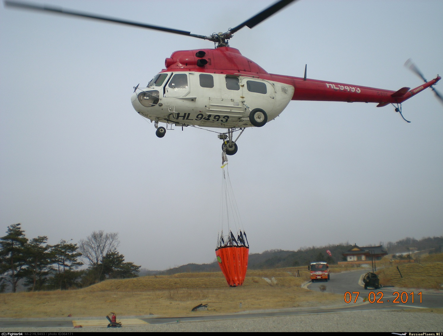 • Примечания: Тренировочные полеты с бэмбиком. Общий вес подвески 800 кг, вес воды 700 литров. На коротком слинге с вертлюгом.