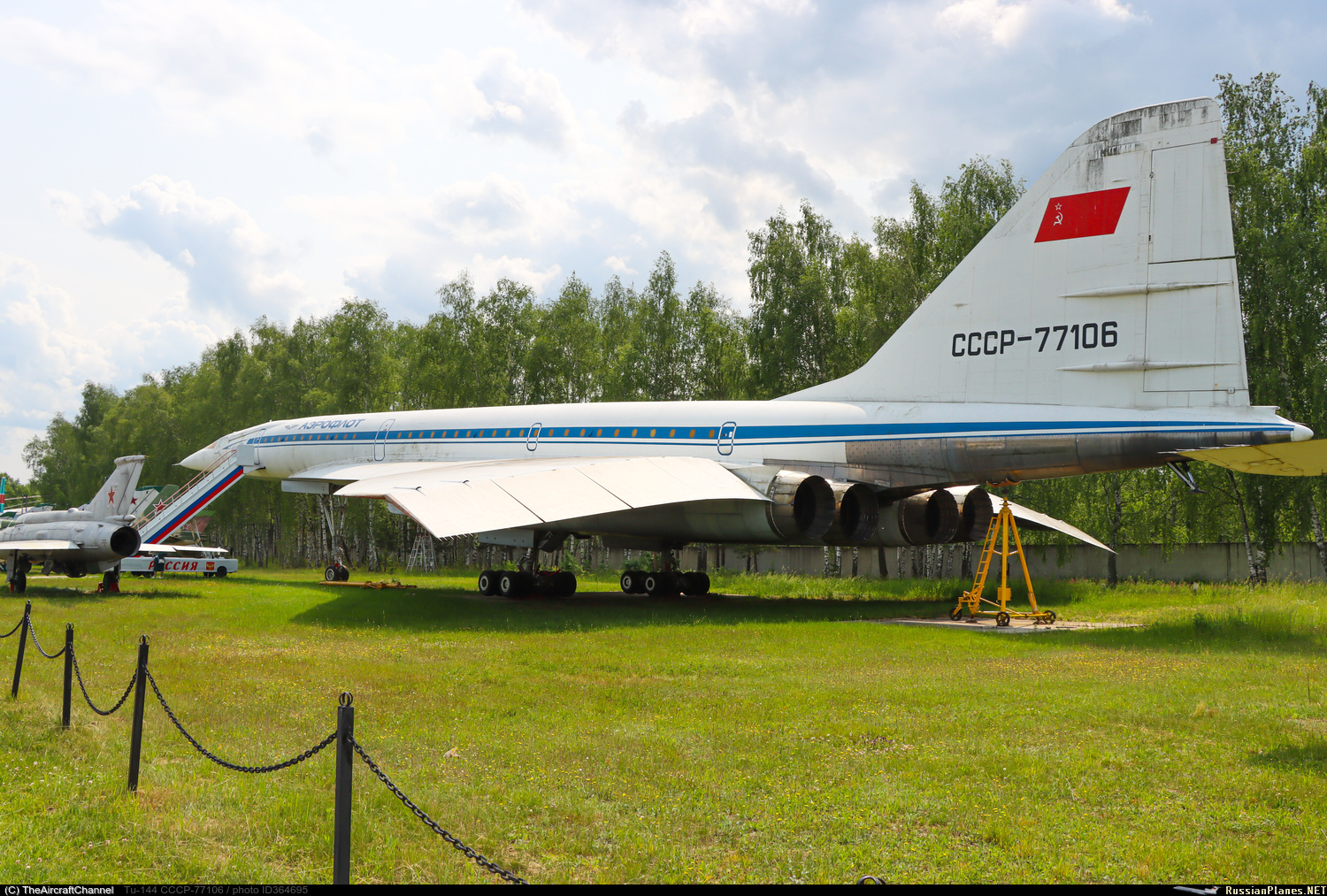 Наш Ту-144 №04-1 бортовой 77106 был изготовлен на Воронежском авиационном заводе, приёмочный полёт состоялся 4 марта 1975 года. Выполнял технические рейсы Москва – Алма-Ата, а также почтовые и грузовые перевозки по этому маршруту. Имел налёт СНЭ 582 часа, из них на сверхзвуке 319 часов 21 минута, совершил 320 посадок. Списан 15 декабря 1979 года по техническому состоянию, после выработки установленного гарантийного ресурса (500 лётных часов в течение трёх лет).