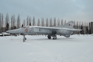 | Табличка перед самолётом гласит, что "МиГ-27 - фронтовой многоцелевой истребитель. Состоял на вооружении с 1950 по 1986 год. На этом самолёте в феврале 1950 года на серийной машине в горизонтальном полёте была превышена скорость звука."