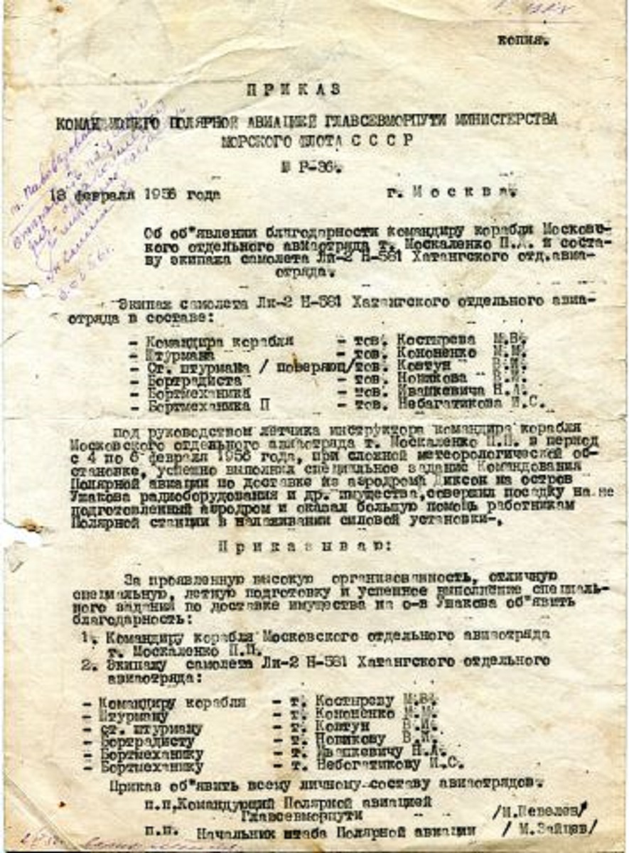| 1958.05.22 | СССР-04232 | Аэрофлот - ГУ ГВФ СССР ( su )→ Управление Полярной Авиации ГУСМП → Хатангский АО — с 1960.04 - переподчинение, переименование: Аэрофлот - ГУ ГВФ СССР ( su )→ Управление Полярной Авиации → Аэропорт Хатанга | летал | ||