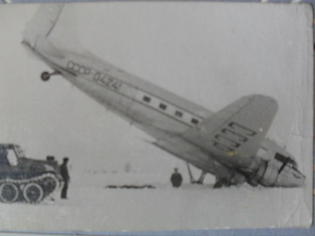 1954г. - вынужденная посадка по вине бортмеханика самолёта - перезаполнение маслобаков маслом. Подробности неизвестны. 18 мая 1969г., при выполнении взлёта с временной площадки Берелях (Якутская АССР), экипаж с проверяющим на борту зам. командира АЭ 248-го ЛО допустил на разбеге уклонение влево от оси ВПП. Самолёт зарылся в снег и встал на нос. Поломка ВС. Фото |